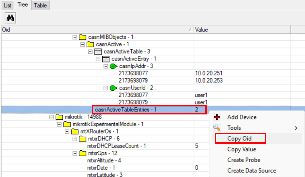 Selanjutnya kita bisa mengcopy OID dengan cara mengklik kanan pada table yang ingin dimonitoring. Contohnya saya akan mengambil OID untuk memonitoring client active PPPOE dirouter.