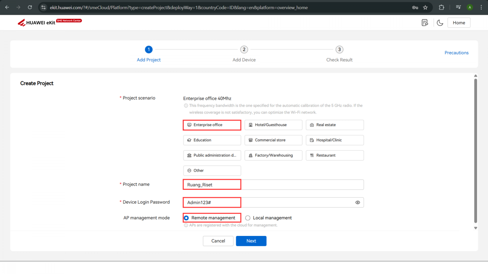 Pastikan perangkat huawei yang digunakan dalam mode awan (cloud mode) dan sudah terkoneksi dengan internet. Perangkat yang digunakan untuk lab kali ini adalah Huawei AP265E.