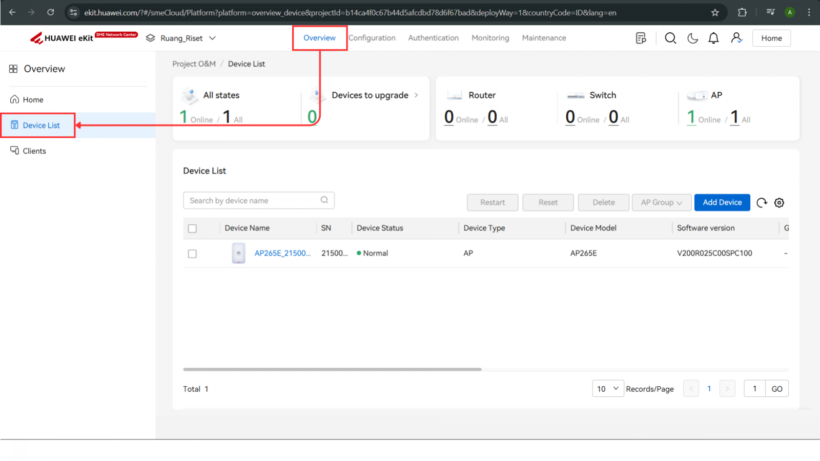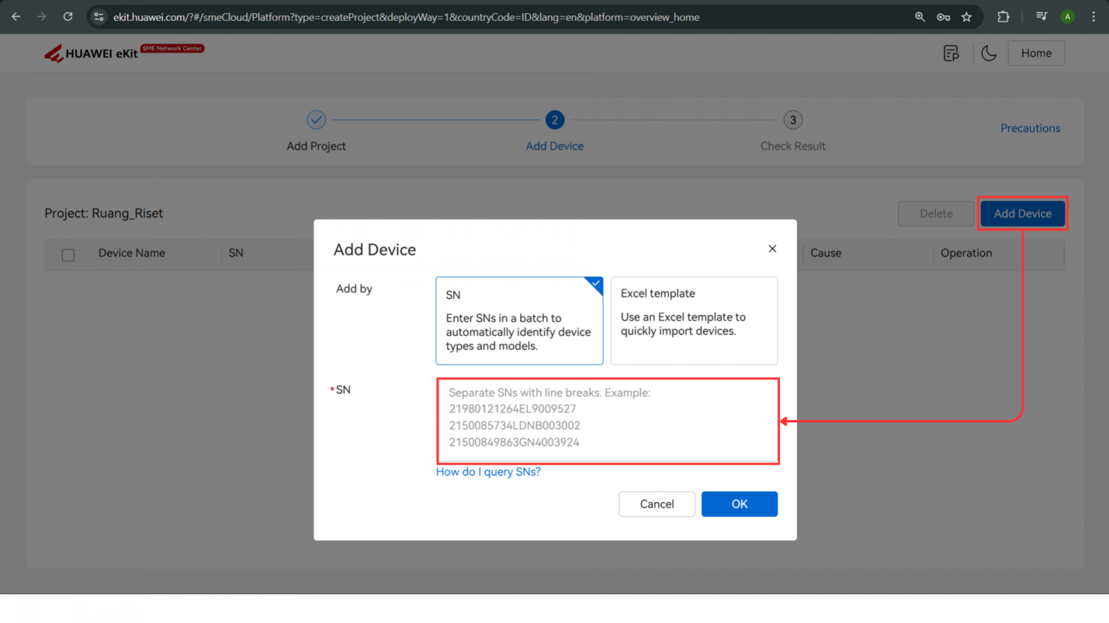 Tambahkan perangkat huawei ke dalam proyek menggunakan Serial Number (SN) perangkat terkait. Jika menggunakan banyak perangkat, Anda dapat menambah melalui import file excel yang dapat memudahkan dalam penambahan perangkat ke dalam proyek.