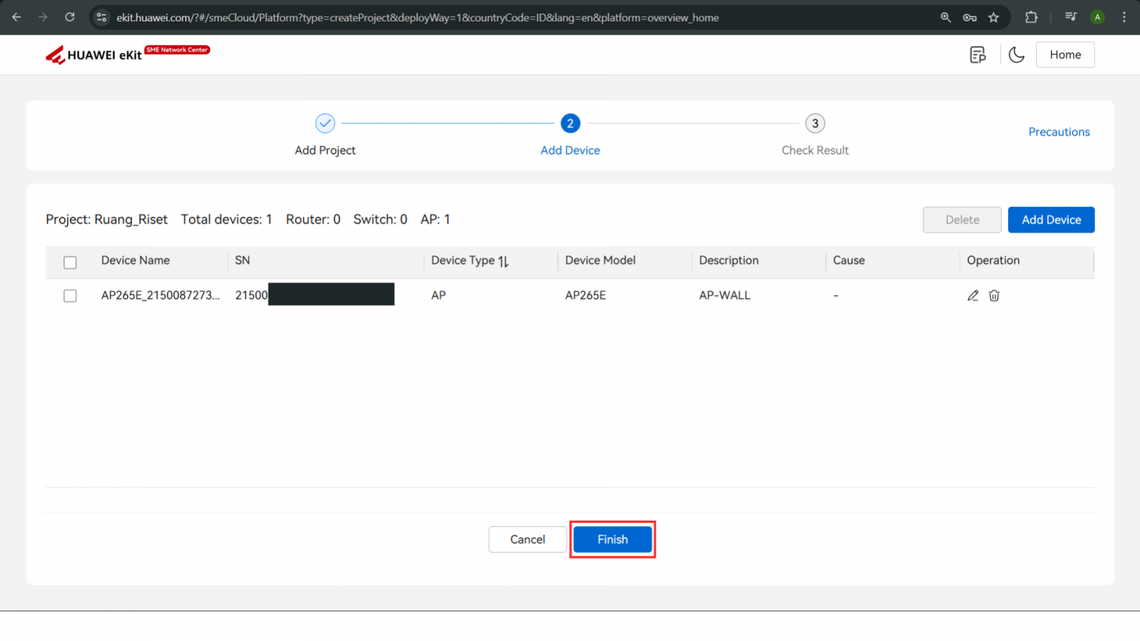 Setelah Serial Number (SN) ditambah silakan klik finish dan tunggu beberapa menit untuk perangkat menyinkronkan dengan server huawei ekit.