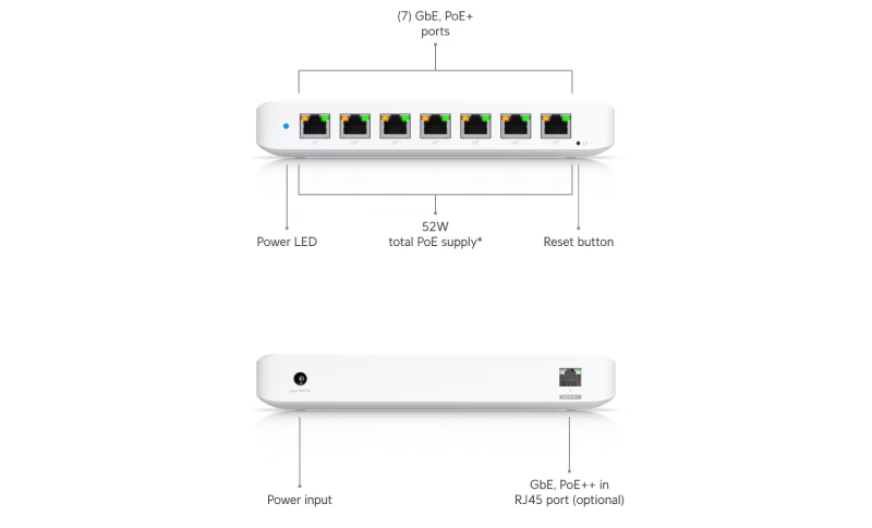 Ports 8 x 1 GbE RJ45 (7 PoE+; 1 PoE++ input)