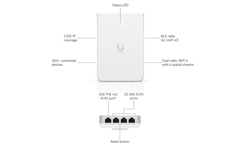 Wall-mounted WiFi 6 AP with 6 spatial streams and a built-in 4?port switch ideal for single-room coverage in hospitality environments.