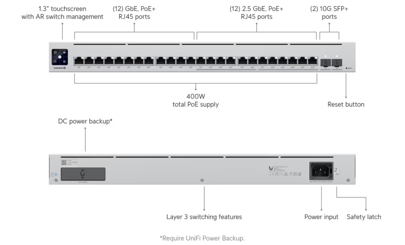 USW-Enterprise-24-POE UniFi 24-port, Layer 3 switch with 12-port GbE PoE+, 12-port 2.5 GbE PoE+ and 2-port SFP+ 10G.