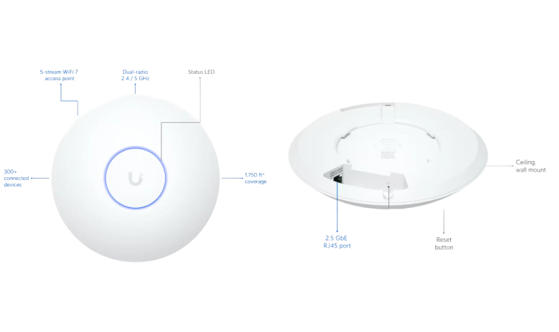 Compact, ceiling-mount WiFi 7 AP with 5 spatial streams and extended signal range.