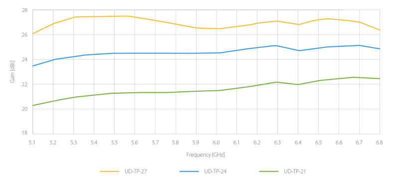 Gain antena yang stabil sangat penting untuk menjaga performa koneksi yang andal. Antena UltraDish TP memiliki gain yang konsisten di seluruh rentang frekuensi 5,1 hingga 6,4 GHz. Dengan begitu, Anda bisa memanfaatkan seluruh spektrum dari band UNII-1 hingga UNII-5 dengan kinerja yang tetap stabil, tanpa terpengaruh oleh saluran (channel) yang digunakan.