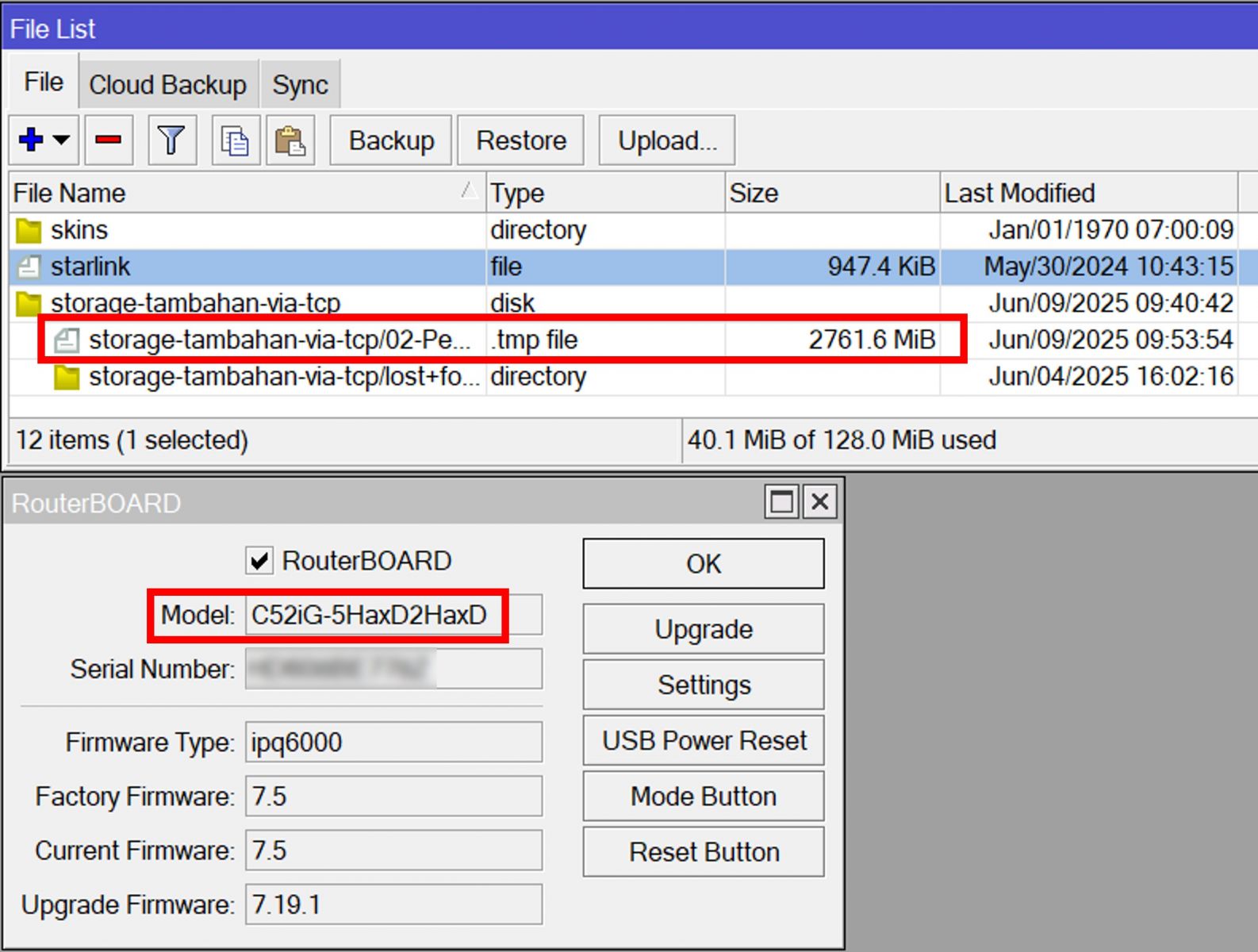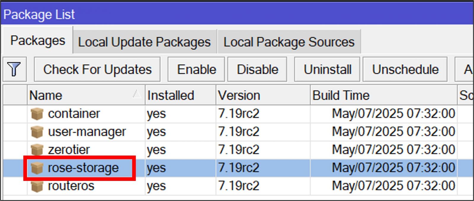 Setelah itu pastikan juga pada kedua router sudah terdapat package “rose-storage” dan saat ini untuk melakukan percobaan kita menggunakan routeros versi 7.19rc2.