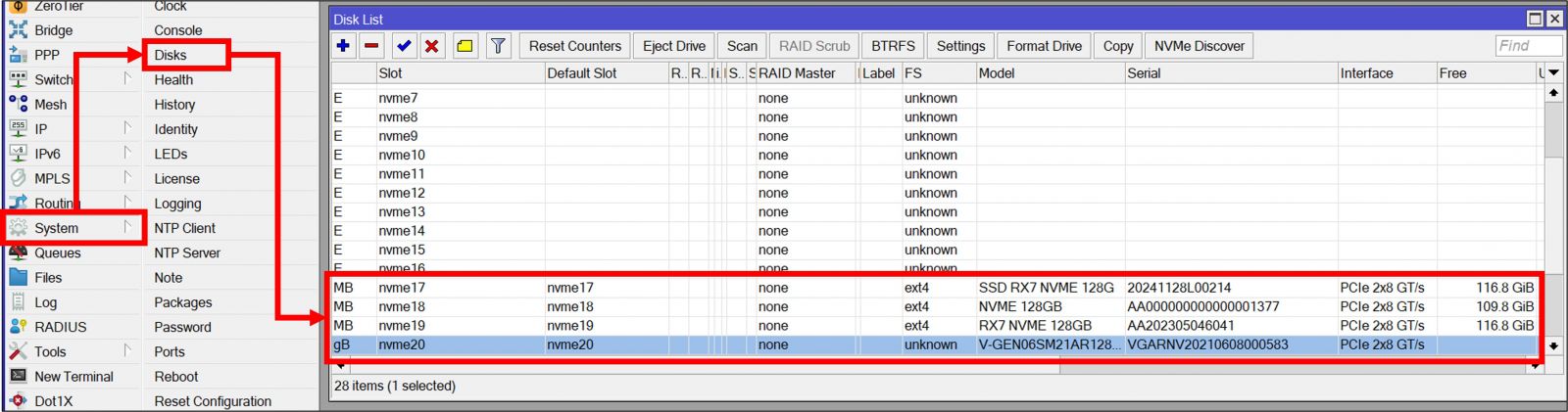 Selanjutnya, pada Router Data Server pastikan sudah terdapat disk/NVME yang ter-install pada menu system -> disk