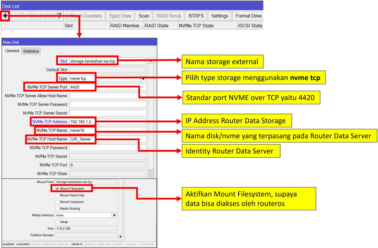 Pada implementasinya kita juga bisa menggunakan perangkat routerboard MikroTik lain yang sudah memiliki slot storage atau bisa juga menggunakan perangkat server lain yang sudah terdapat fitur “NVME over TCP”.