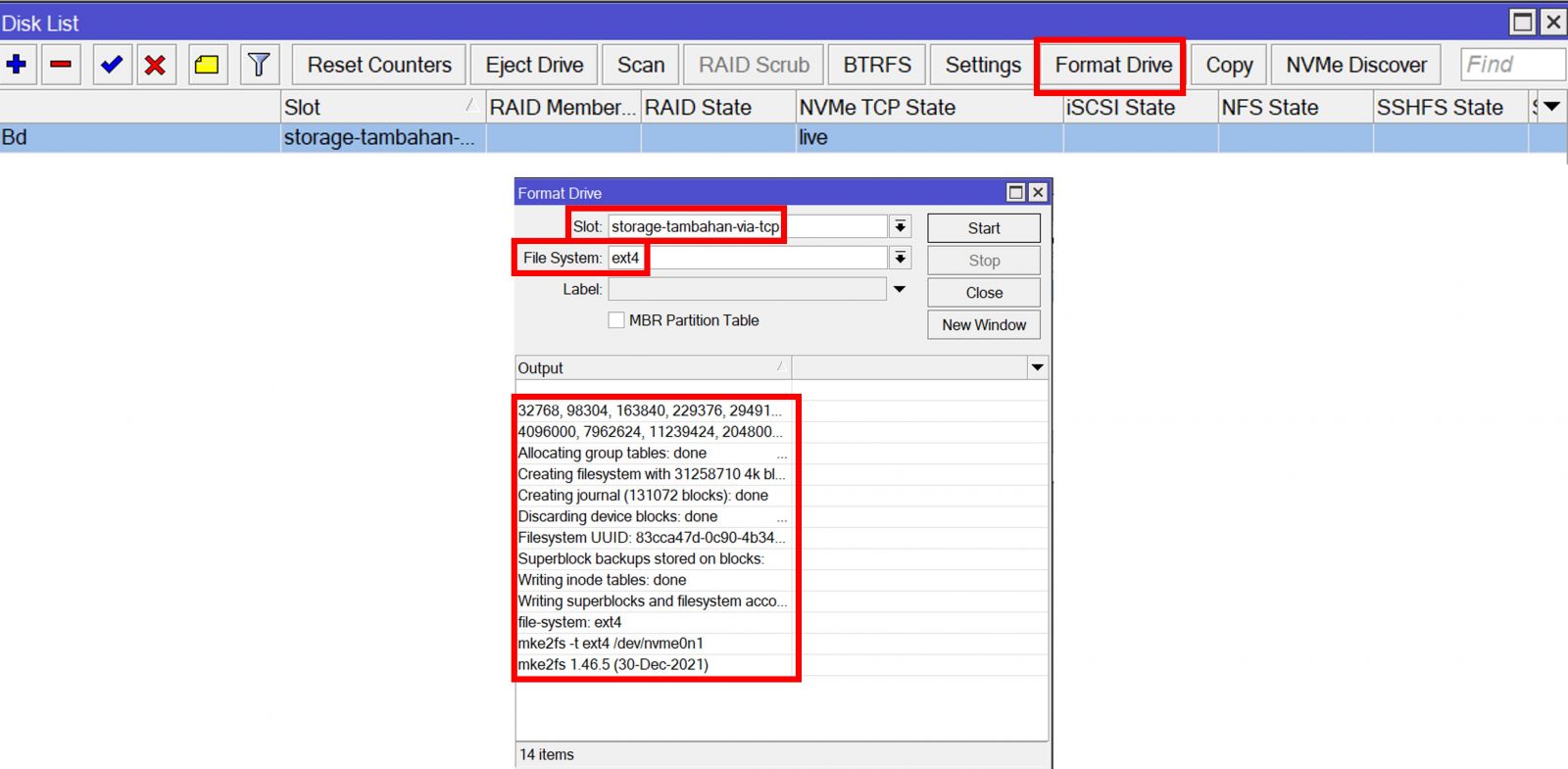 Selanjutnya kita akan melakukan percobaan pada nvme19 yang akan dijadikan untuk storage external pada perangkat hAP AX2, untuk konfigurasinya silakan anda masuk ke dalam menu