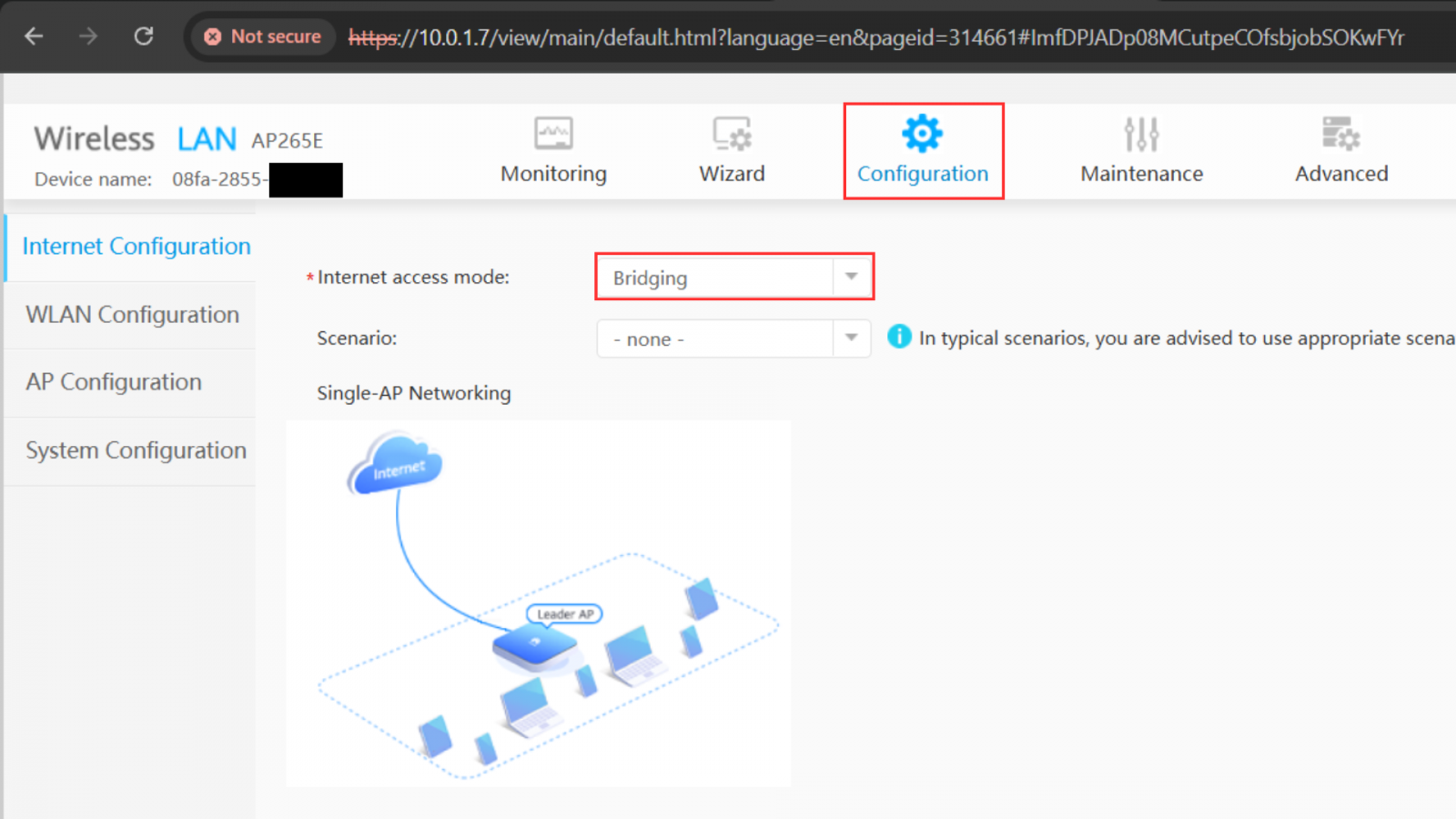 8. Kemudian masuk ke menu configuration >> internet configuration dapat dilihat, default konfigurasi fat mode di AP huawei adalah bridging. Dengan demikian IP yang didapatkan oleh laptop tetap satu segmen dan DHCP server nya berada pada router gateway.