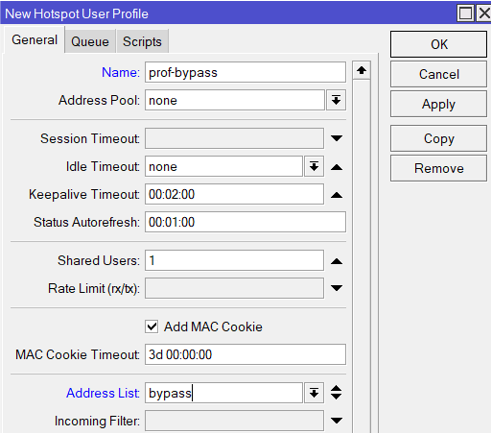 2. Kemudia kita bisa masuk ke menu User Profile untuk memasukan client yang aktif ke address list bypass