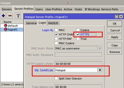 Kedua, Kita akan mengaktifkan HTTPS Login pada hotspot di 'Server Profiles' hotspot. Selain itu kita juga harus menambahkan sertifikat ke parameter SSL Certificate.